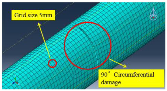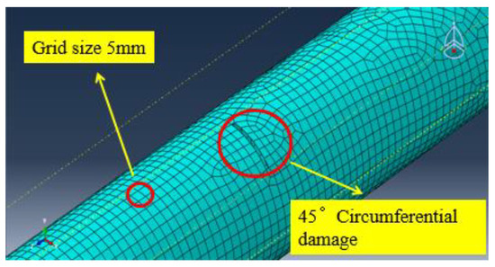 The FEA meshing of the pipe model with the circumferential damage of a radius angle of 90° is shown in Figure 17.