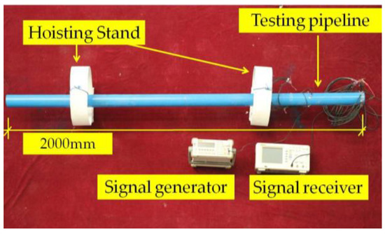 A pipe structure health monitoring test platform was established, aimed at validating the proposed FEA model and the numerical simulation results. The main experimental setup was as follows. The RIGOL DG10×2 dual channel function arbitrary waveform generator enables the output of five types of basic waveforms and arbitrary waveforms with the frequency range from 1 μHz to 5 MHz, which fully meets the requirement of the damage detection. A RIGOL DS1000 digital oscilloscope is used as the signal acquisition device in this experiment. It plays the functions of triggering, collecting, storing, and calculating the signal, as well as carrying out a 0.67 Msps sampling rate. Two groups of PZT patches (d13 type) and an experimental pipe were also applied. A computer was used for data processing and analysis. The setup of the pipe test is shown in Figure 21.