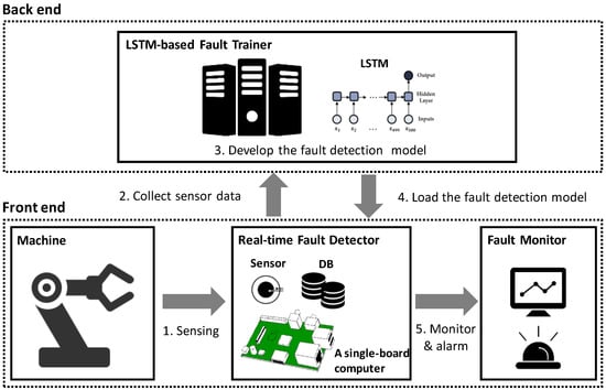 - Real-time fault detection based on machine learning—The proposed system adopted the machine learning approach which learns the collected data and improves the prediction performance. The developed model based on machine learning is loaded on an edge device to detect faults in real time.