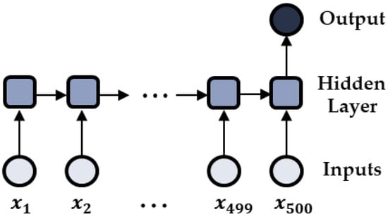 LSTM, which improves typical RNN, is often used to address time-series data, such as speech recognition [] or natural language processing []. LSTM can overcome the gradient vanishing problem, which means that the weights of the neural networks are not updated well in the long time-series data, by configuring the forget gate, input gate, and output gate to adjust the amount of information within a cell [,]. The forget gate determines how much information from the previous cell should be forgotten. The input gate determines how much information the current input value will receive, while the output gate decides how much information should be transmitted from the cell. Using these three gates, a good output can be created by storing the useful information for a long time and forgetting the useless information [].