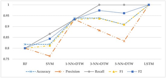 To verify the developed LSTM-based model, k-NN + DTW (k = 1, 3, 5), random forest (RF), and support vector machine (SVM) were used. k-NN + DTW is known to perform well in time-series data classification, while RF and SVM are also known as good-performance algorithms in the machine learning field [].
