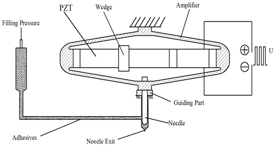 The operating principle of the piezo jet dispenser with a diamond amplifier is the following: adjust the needle to make it come into contact with the nozzle and form a closed chamber. Then, apply pneumatic pressure to the fluid and make it flow into the chamber. A pulse voltage is applied to the piezo stack to cause a vertical stretching motion of the amplifier. Consequently, the needle and the amplifier obtain an up-and down motion. The fluid, driven by the pneumatic pressure, flows into the nozzle. When the needle hits the nozzle, the fluid is rapidly ejected through the nozzle and breaks from it with fluid momentum. The system mainly includes Excitation voltage, PZT, Wedge, Amplifier, Guiding Part, Needle, Filling Pressure, Adhesives, and Nozzle Exit, as shown in Figure 1.