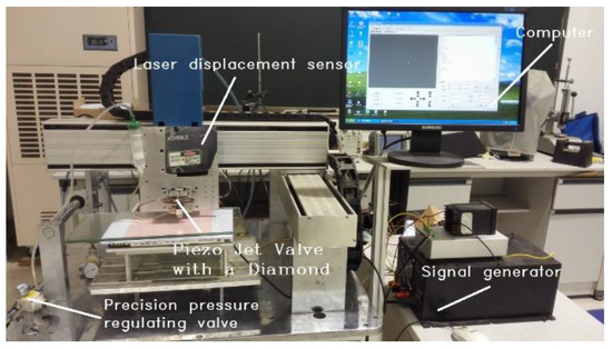 The experimental system consists of four parts: a piezo jet dispenser, a signal generator, a glue supply system, and a laser displacement sensor system. The experiment facilities used to measure the dynamic characteristics of the amplifier are shown in Figure 2; the structure diagram is shown in Figure 3.