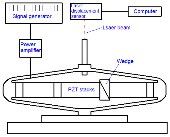 The needle’s displacement is measured by the KEYENCE LK-G laser sensor, whose sampling frequency is 20 KHz. The control signal, generated by an AFG-3102 signal generator from Tektronix, Inc (Beaverton, ON, USA), is amplified by XE-500 power amplifier. As the pulse voltage is supplied to the piezo stacks, the diamond amplifier with the needle is fixed on the table, and a laser sensor is fixed on the top of the needle. When the experimental system works, a laser beam shoots at the needle vertically, and the real-time displacement is tested and recorded.