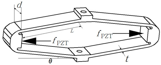 According to the principle of conservation of energy, work done by fPZT is transformed into the bending potential energy and the tensile deformation energy. Then, the following Equation (13) can be obtained for the amplifier.