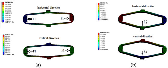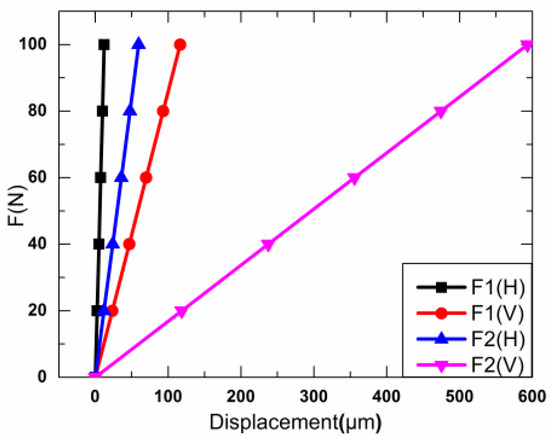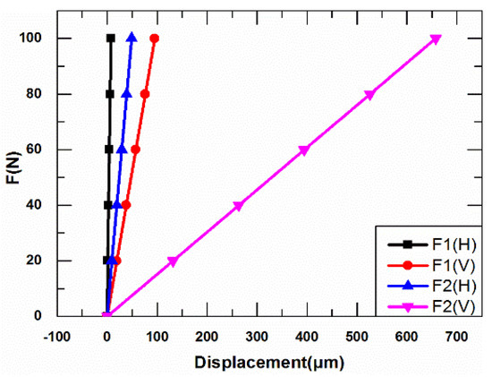 Through the results and discussion in Section 3, the displacements of the new diamond amplifier under FH and FV are got and shown in Figure 12. The new K1, K′1 and K2, K′2 can be obtained. The results are listed in Table 6.