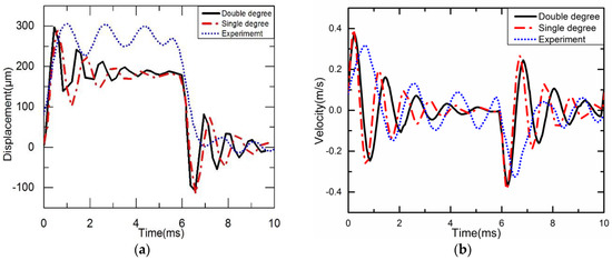 According to Equations (8) and (22), Simulink is used to obtain the vertical displacement curves of the needle. The experimental method is used to get the displacement of the needle. A square wave voltage is applied. The voltage amplitude is 130 V, the time is 6 ms, and the frequency is 100 Hz. The displacement curves of the needle under double degree and single degree dynamic models and the experimental system in one cycle are shown in Figure 11a, and the velocity curves of the needle are shown in Figure 11b.