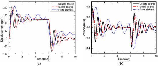 In the same experimental conditions as the previous example, the parameters of the new amplifier and the values of the obtained variables are substituted into the Equations (8) and (22). Simulink is used to obtain the vertical displacement curves of the needle under double degree and single degree dynamic models. Then, the vertical displacement curve of the piezoelectric driving dispenser is obtained through finite element analysis with Comsol.