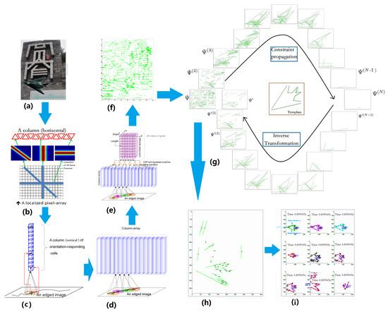 Architecture. (a) is the input image; (b) shows a basic functional unit. The slopes of linear stimulus for which these cells are responsible are different and exclusive. The response value of a cell is determined by its sensitive linear stimulus length and position, which can be implemented by a real-time convolver of a 2D linear Gaussian function. (c) A column of orientation-responding cells. A primary visual cortex-inspired column is composed of dozens of orientation-sensitive cells. They share a common receptive field on an image, but each cell is in charge of a specific and exclusive linear stimulus occurring in the receptive field (RF). (d) Column-arrays. A long line might pass through multiple RFs. Perceiving it can be seen as a fitting operation, subjected to multiple constraints provided by those RFs. A number of columns can be orderly arranged to form an array. The receptive fields of these columns might be partially overlapped. This array processes the image in a compound receptive field of all columns. (e) The architecture. At the top of column array, there is a 3D matrix of grids. Each grid is a register for storing a line. X and Y index the line’s center position, and the vertical position of the grid indexes the line’s slope, and the value stored in a grid is the line’s length. (f) An example of line extraction by the proposed architecture. (g) The process of constraint propagation. (h) Lines resulting from the constraint propagation. (i) The object estimation by verification. The location, scale, and orientation of the object can be verified through searching path. The top nine paths satisfying the geometric constraints of were found. Each path represents an estimation of the object. It is obvious that our method not only efficiently detected the object but also estimated the location, scale, and orientation of the object.