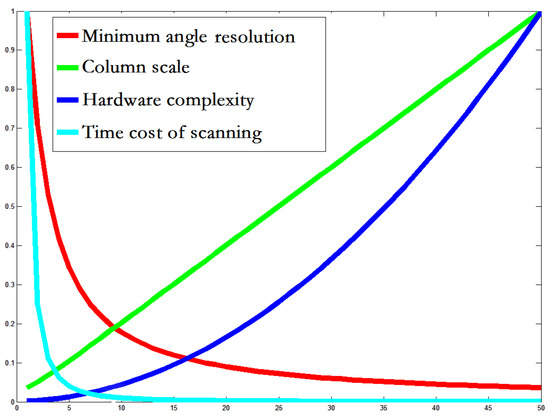 The relations to the complexity of logical RF in the architecture. The x-axis is the RF size of a column modular and the y-axis is normalized to adapt four different values: minimum angle resolution, RF size of a column, the total hardware complexity, and the time cost of scanning. Based on these four curves, we can find one or several balance points, at which the performance is not optimal but its corresponding cost is relatively low in the proposed architecture.