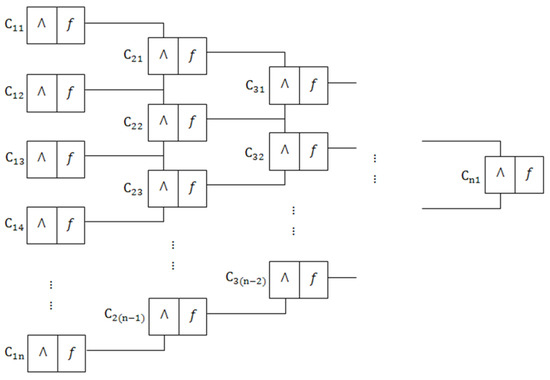 The process of constraint propagation. In the highest layer, means that one line in this layer represents a combination of basic lines that might satisfy the geometric constraints in ∼. means the n constraint in the first layer. means two lines satisfy the geometric constraint. f means two lines that satisfy the constraint are merged into a new line. By constraint propagation, it is possible to efficiently detect lines that satisfy the first layer constraints ∼.
