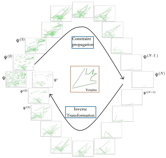 Example of the process of constraint propagation. For a shape-based template consisting of N lines, there are N layers of constraints ∼. In the first layer, the lines that satisfy the constraints in the first layer are merged into new lines in the second layer. Similarly, the lines that satisfy the constraints are merged into new lines in the next layer. As the layer number increases, the number of lines decreases. Therefore, this indicates that the lines satisfying the constraints can be extracted. For each geometric constraint in , a corresponding candidate set of pairs of lines could be found. In this candidate set, each pair of lines was merged into a new line in . Similarly, N layers of candidate sets of lines could be found as ∼. In the highest layer , there must be lines, each of which represents a combination of lines that might satisfy each geometric constraint in . As shown in the figure, in , one picked line that mostly satisfies the constraint can be inversely transformed into . Through constraint propagation for line-extraction, it is possible to efficiently determine target objects satisfying the shape-based geometric constraints.