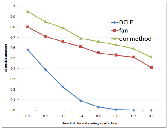 Accuracy of the methods. The horizontal axis shows the threshold for determining a detection, and the vertical axis shows the detection accuracy.