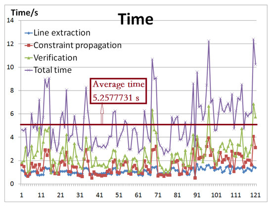 The time our method required for the dataset of images. The horizontal axis shows the input image index, and the vertical axis shows the time the current approach required. For one input image, the total time our method required was approximately 5 s.