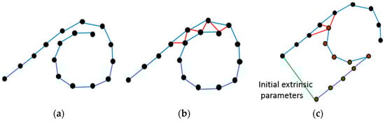During the VO process, some keyframes are chosen such that they have more inliers, and a new keyframe should be neither too far nor too close to the last chosen keyframe. The initial pose graph is obtained after VO, with the keyframes as vertices and the transformation between two neighboring keyframes as edges (Figure 2a). Then we add loop constraints to the graph. To find loop constraints, we determine all the keyframes before the current keyframe to see whether these keyframes have a successful feature matching with the current keyframe. If feature matching is successful, we add an edge between the two frames in the pose graph (Figure 2b). From the multiple cameras we choose one camera as the reference camera whose first frame’s coordinate system is defined as the world coordinate system. Then we add edges between the reference camera’s first pose and other cameras’ first poses separately, set the transformation matrix as the identity matrix (Figure 2c). We fix the reference camera’s first pose and optimize the pose graph by G2O (an open-source C++ framework for optimizing graph-based nonlinear error functions). After the optimization, we obtain all cameras’ first poses, which are the relative transformations between cameras and the reference camera. The extrinsic parameters of multiple cameras are estimated.