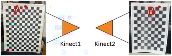 The placement of the two calibration boards in the two-Kinect extrinsic calibration accuracy experiment. A and B are the two corner points to be measured distance.