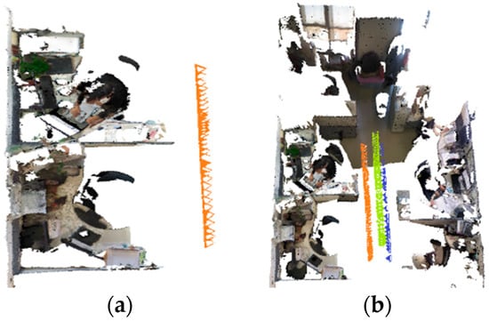 Comparison of single-camera SLAM result and three-camera SLAM result. (a) is a single-camera SLAM result, the movement trajectory is in orange. (b) is a three-camera SLAM result with the same movement trajectory as (a), different colors mean different camera trajectories.