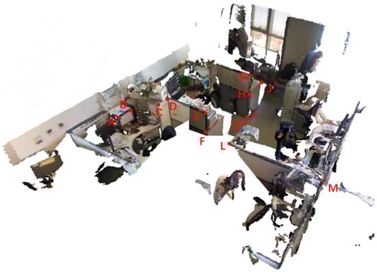 We also use monocular RGB-D SLAM InfiniTAM [] to reconstruct the 3D model (Figure 7) of the same area as Figure 5. To illustrate the reconstruction accuracy of real-world scenes, we compare the actual lengths of seven line segments on the scenes with the lengths measured in the reconstructed model. The selected line segments and their lengths are depicted in Figure 8 and Table 2. The RMSE of the lengths measured in our reconstructed mode is 1.55 cm and the RMSE of the lengths measured in the reconstructed mode by InfiniTAM is 1.34 cm. From which we know that our reconstruction accuracy is fairly accurate.