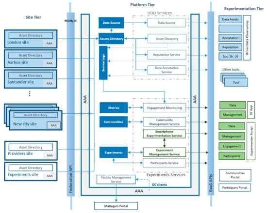 The OrganiCity platform follows a three tier design, depicted in Figure 1. The first tier, so called Site Tier, embraces the federated cities, or sites, that bring their data to the platform through the federation API. Then the Platform Tier provides all the platform services and components to support data, experiments, and platform management. It is worth noting that, apart from a few base platform components, most of them have been developed following a micro service approach so that they run independently and communicate using RESTful APIs. As can be seen in Figure 1, we group the services in Urban Data Observatory (UDO), and Experiments ones. The first group is responsible for data management, while the second one carries out all the task related to experiments. Finally, an additional service performs platform management tasks.