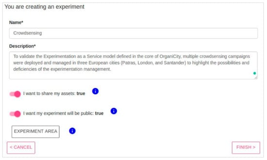 Step 1: Definition of generic information (see Figure 2). Once the experiment concept is defined and the regarded application properly tested, the experiment can proceed with the experiment registration in OrganiCity. In this sense, it is required that the experiment provides essential information regarding the experiment such as its name and description as depicted in Figure 2. Along with the name and description, the experimenter is also required to provide the overall duration of the experiment and the privacy level of the assets generated by the experiment. The privacy level defines whether the information generated by the experiment may be used by other experimenters.