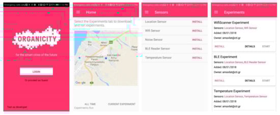 Step 6: Finally, volunteers can install the smartphone app by downloading it from OrganiCity website. Inside the app, selecting, enabling, and installing sensors and experiments can be easily performed by selecting/deselecting a checkbox. Experiments are downloaded in the background and execution starts automatically. Figure 5 contains screenshots from the SE Android application. The first two screenshots are the lists of sensing plugins available and the experiments. Participants simply need to select via the checkboxes the ones they wish to use and then click the respective “Install” button to start the installation process. The third screenshot is from the home tab of the application when the user can track his location on the map and basic information on the status of the experiment executed. In certain experiments, the current data are also available (if their data types can easily be depicted). This screen contains amongst others information about the total data points gathered thus far, the time spent online, ranking of the user and achievements acquired both under the scope of the experiment and in general. In addition, this tab contains a button to download the participant’s contribution and a couple of graphs showing the contributions of the user during the previous week and the areas visited as a heat map.