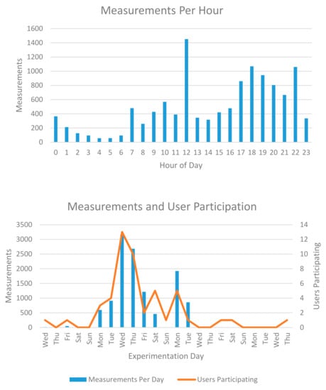 As mentioned previously, the system can output information in real-time regarding, for example, the distribution of readings collected for each time of the day, or other metrics for end-user engagement, which we utilized to provide some general directions to the involved participants, mainly regarding areas left with no readings produced. In Figure 6, we can see that the participants, in general, contributed with more readings during the afternoon, and that after an initial growing spike of interest, they stopped contributing after a few days.