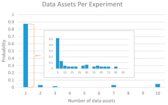 Furthermore, we have observed a rather high variance on the number of data assets created by the experiments. In this regard, Figure 7 illustrates the distribution of a number of data assets created by experiments. As can be observed, most of the experiments generate fewer than 100 new data assets, while in a few cases, they have generated around 1000. It is worth highlighting that, in order to keep control of the facility during the open calls, the number of assets per experiment was bounded to 1000 (i.e., no experiment could create above 1000). In addition, Figure 8 also reveals that almost half of the experiments have only created five or fewer data assets.
