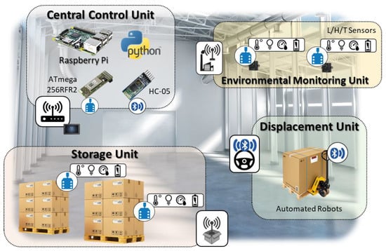 Figure 1 shows the top-level representation of the here proposed architecture. It schematizes a WSN-based architecture for functional warehouse management, through the continuous monitoring of environmental parameters. The automated smart system analyzes these parameters and combines them to reach a spatio-temporal optimization of the products’ SL. The system realizes this condition, acting directly on the pallets’ positions. The WSN-based architecture is composed of four main functional units: (i) Central Control Unit, (ii) Environmental Monitoring Unit, (iii) Storage Unit and (iv) Displacement Unit.
