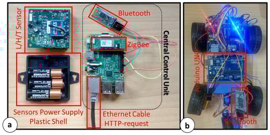 Architecture components: (a) L/H/T sensor and Raspberry Pi 2 Model B+ equipped with ZigBee and Bluetooth modules; (b) Prototype car driven by Arduino UNO core and Bluetooth.