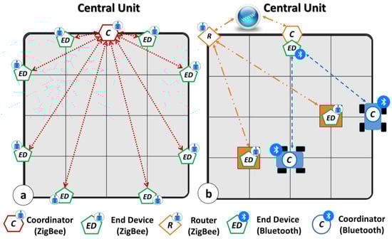 Finally, a point-to-point Bluetooth-based network handles the Displacement Unit (Figure 3b—Blue lines). In this case, the Central Unit operates as End Device communicating, when asked by the network Coordinator, a string that contains: (i) the address of the transporter selected for the displacement and (ii) the destination position. In this net, all the robots act as Coordinator, asking to the Central Unit the transmitted string content respecting a time multiplexing.