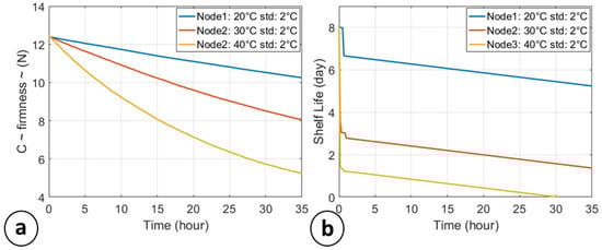 Food quality decay: (a) changes in the quality factor c (firmness [N]) of tomato stored at different temperatures; (b) Shelf life modulation of tomatoes at different temperature.