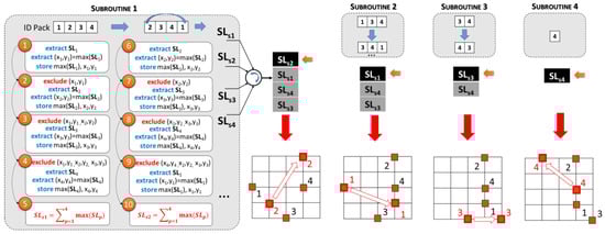 For the sake of clarity, the routines on which the algorithm is based are schematically reported in Figure 6, considering the displacement of four pallets. During the 1st subroutine (Subroutine 1—Figure 6):