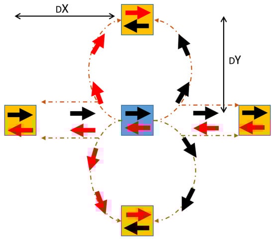 Figure 7 shows the unified movement circuit that takes into account all the available movements and initial direction of a selected transporter (via add_btT). A blue square represent the instantaneous starting point, while the orange ones represent the available target positions. It is clear that all the suitable positions differ of a single step along the x or y axis. Figure 7 shows that the implemented algorithm is suitable for all the final direction of the transporter (e.g., red or black arrow). The final direction determines the servomotor and DC motors driving bits (SM0, SM1, DCm0, DCm1).