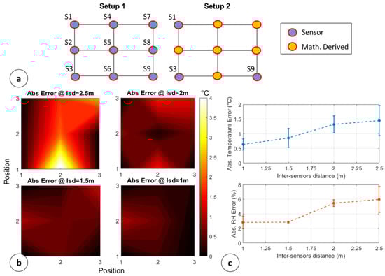 where is the temperature in the (i,j) lattice position for the Setup 1 and the is the temperature in the (i,j) lattice position for the Setup 2. Sixteen monitoring events for each evaluated Isd have been realized in order to extract a statistical behavior. The Isd was ranged from 1 m to 2.5 m with step 0.25 m. For sake of clarity, Figure 8b shows the absolute error of a single run for Isd = 1 m, 1.5 m, 2 m, 2.5 m, highlighting the expected decreasing trend when the sensors become close among each other. Figure 8c shows the average and standard deviations of temperature and RH errors versus Isd. The statistical behavior shows that the sensors cannot be placed further than 2.5 m in order to ensure a temperature error < 2 °C and a RH error < 8%. If the sensors’ accuracy changes, another characterization needs to be done. Moreover, in general, it is possible to extract an empirical rule about the number of needed sensors to cover the storing room with a temperature error lower than the sensors accuracy: