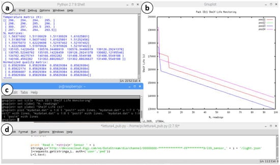 Screenshot of RPi-based Central Control Unit display: (a) Numeric monitoring of SL, C, T, etc. (b) Chart of SL monitoring of the selected positions for a specific pallet; (c) Chart settings panel; (d) HTTP-request panel for cloud reading.