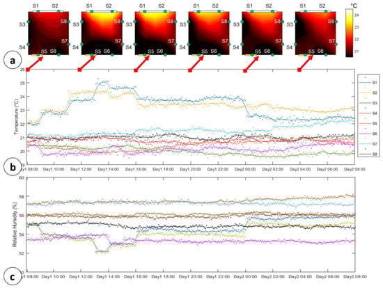 Sensors readings: (a) Testing room heat-map evolution during 24 h with step: 2 h; (b) 24 h Temperature readings by n = 8 sensors (dots) and OLS estimations (solid line); (c) 24 h Humidity readings by n = 8 sensors (dots) and OLS estimations (solid line).
