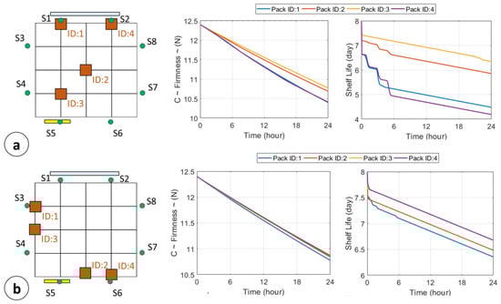 Shelflife Optimization: (a) Initial position of the four pallets, firmness decay and SL prediction along the 24 h; (b) Final position of the four pallets, firmness decay and SL prediction along the 24 h.