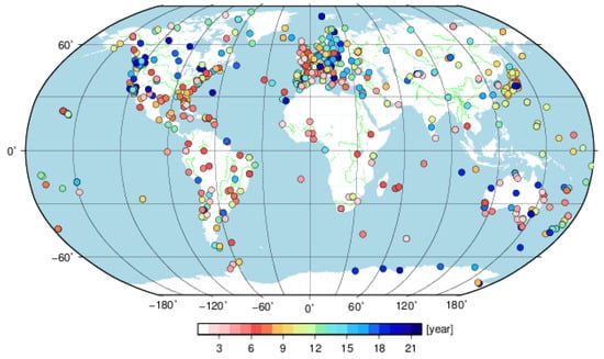 To resolve frequencies higher than 1.0 cpy, stations with observation time spans less than two years (or 730 observations) are eliminated in the normal equation for each SINEX solution. An iterative outlier detection and deletion process is applied in the data preprocess until no observations have residuals larger than 5-sigma for each station. Moreover, stations with a data gap larger than 20% are also excluded. As a result, 647 stations in total remain in the final stacking solution. Figure 1 shows the distribution of the GNSS sites with different observation time spans. There are 33 of 647 stations with observation time spans less than three years. The median observation time span is 9.9 years and the number of stations with observation time spans larger than 12 years is 192. There are also 14 stations with observation time spans more than 20 years.