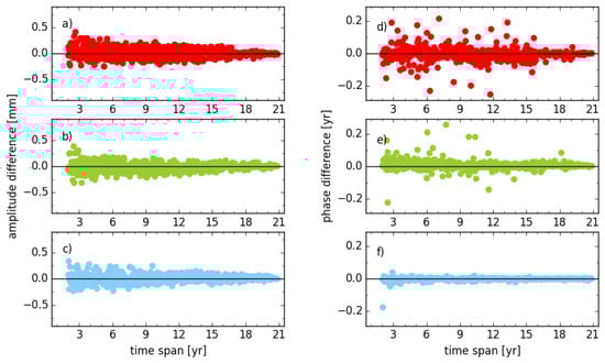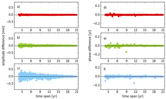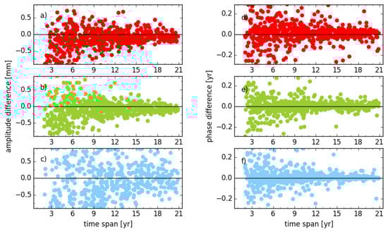 Amplitude and phase differences of annual signal between solution cova_tr_s2 and cova_tr_s2d2 for stations with different observation time spans; (a,d) for east; (b,e) for north; (c,f) for vertical components.
