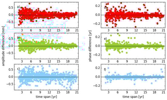 Amplitude and phase differences of the annual signal between solution unit_xxx_s2 and unit_tr_s2 for stations with different observation time spans; (a,d) for east; (b,e) for north; (c,f) for vertical components.