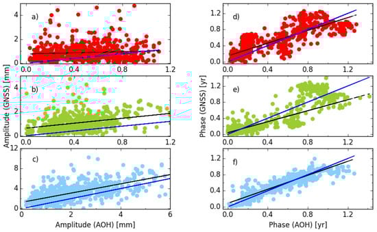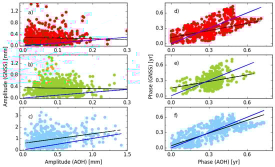 The agreement performance of annual signal between GNSS and AOH; (a,d) for east; (b,e) for north; (c,f) for vertical components. The phase is divided by 2π and, to keep the absolute phase difference less than 0.5 year, the values out of the range from −0.5 to 0.5 year are added one cycle and not used for fitting. The black line is the linear fitting result between GNSS and AOH and the blue line shows 1:1 perfect agreement.