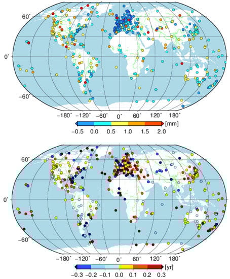 - Rebischung, P.; Altamimi, Z.; Ray, J.; Garayt, B. The IGS contribution to ITRF2014. J. Geodesy 2016, 90, 611–630. [Google Scholar] [CrossRef]