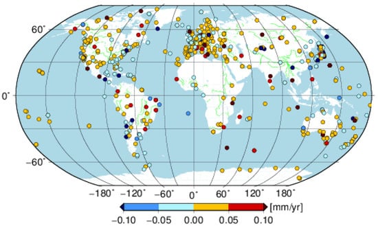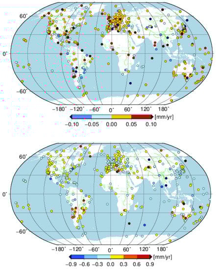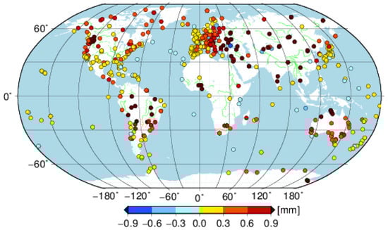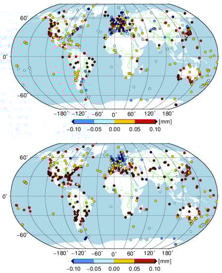 Figure 9 illustrates the WRMS difference between cova_tr_s0 and cova_tr_s0 with seasonal displacements corrected by AOH for each station. There are 62%, 72% and 90% of 647 stations with WRMS reduced when the residuals of solution cova_tr_s0 are corrected by the AOH model. A better performance of the vertical component than the results of Jiang, W. et al. [13] is found, whereas, in that study, three different environmental loading models were compared and the best performance was 74% of 233 stations with the WRMS reduced in the vertical direction. The better performance in the current study might be attributed to the latest data reanalysis methodology and the model in the second IGS reprocessing campaign (http://acc.igs.org/reprocess2.html). While the residuals of cova_tr_s0 are corrected by the AOH, the corresponding mean WRMS reduction of all stations is 0.03 mm, 0.07 mm and 0.41 mm for the east, north and vertical components, respectively. Taking as the contribution of the AOH model to the GNSS WRMS reduction, then the seasonal signals predicted by the AOH model could explain 18%, 29% and 62% of the seasonal signals derived from the GNSS position series for the east, north and vertical components, respectively.