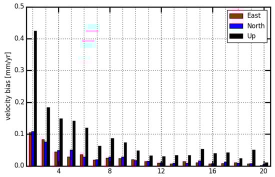 To compare the velocity parameters between with and without seasonal signals parameterized in the stacking model, Figure 10 illustrates the velocity difference between solution cova_tr_s0 and cova_tr_s2 of the selected 647 global distributed stations with different observation time spans. Concerning the horizontal velocity difference, most stations have a velocity bias of less than 0.1 mm/yr. There are 82% and 78% of stations with a velocity bias falling into the range −0.05 to 0.05 mm/yr for the east and north components, respectively and 91% of stations with an absolute velocity bias less than 0.1 mm/yr for the horizontal component. Generally, the shorter the observation span (see Figure 1), the greater the velocity bias obtained for the selected stations in this paper. The large amplitude of periodic signals could also enlarge the bias [39], which is the case for the velocity bias in the vertical direction. Regarding vertical component, the percentage of stations with velocity bias falling into the range −0.05 to 0.05 mm/yr is only 54% and 90% of stations have an absolute bias less than 0.3 mm/yr.