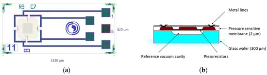 (a) A MEMS sensor element, top side view; (b) cross-sectional view.