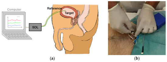(a) The illustration of the suprapubic approach with one target sensor probe in the urinary bladder and a reference sensor probe outside the bladder; (b) Suprapubic approach for cystometry, used in a clinical trial on a sample of convenience.