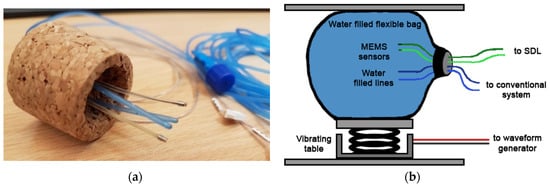 Two MEMS sensor probes and two bladder pressure catheters were inserted into the flexible bag. One MEMS sensor probe and one pressure catheter represented the pressure sensor and the pressure catheter placed inside the bladder, and the other MEMS sensor probe and pressure catheter represented the reference sensor. The MEMS sensor probes and the bladder pressure catheters were thread through a cork cap and positioned in the neck of the water-filled bag (Figure 5a). The MEMS sensor probes were connected to the external Sensor Data Logger (SDL), while the fluid lines were connected to the conventional, stationary cystometry system. The water-filled bag was placed on a vibrating table (Aura Bass Shaker). The water-filled bag was then fixated in between the shaker and a fixed top plate, to ensure that the vibrations from the shaker were well transferred into the water of the bag (Figure 5b).