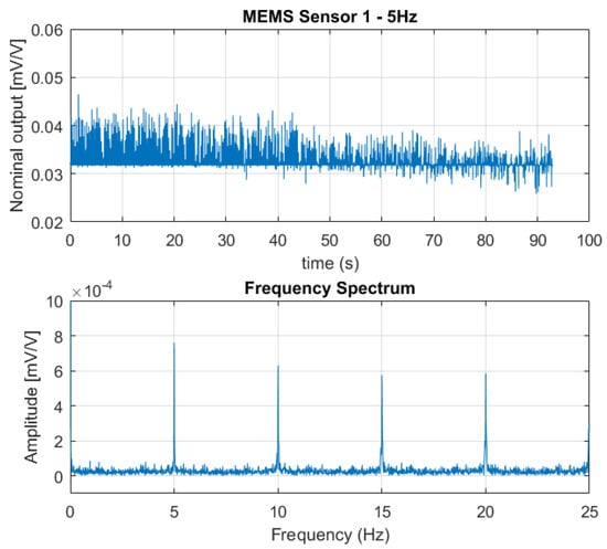 The output signal from one of the sensors in the MEMS-based sensor system as a response to the 5 Hz excitation vibration (above) together with fast Fourier transform of the data set (below). The fast Fourier Transform clearly shows the fundamental excitation frequency at 5 Hz with an amplitude far above the noise floor; also, the higher order harmonics at 10 Hz, 15 Hz, and 20 Hz are visible.
