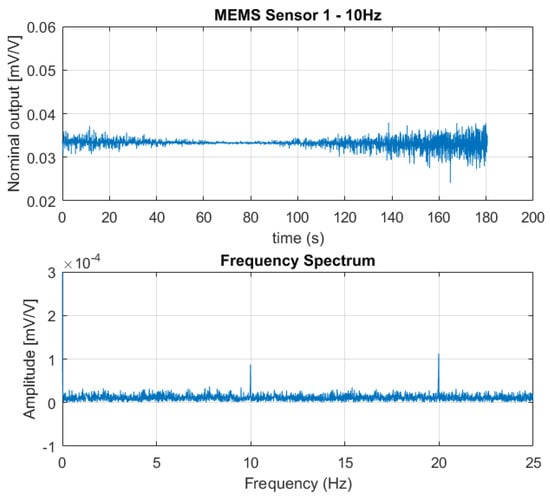 The output signal from one of the sensors in the MEMS-based sensor system as a response to the 10 Hz excitation vibration (above) together with the fast Fourier transform of the data set (below). The fast Fourier Transform clearly shows the fundamental excitation frequency at 10 Hz with an amplitude far above the noise floor; also, the second order harmonics at 20 Hz is visible.