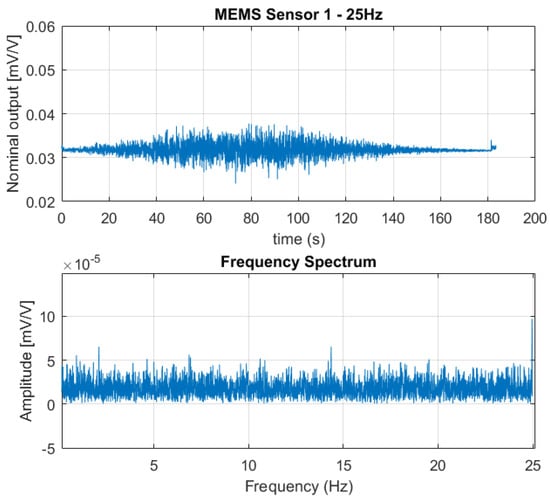 The output signal from one of the sensors in the MEMS-based sensor system as a response to the 25 Hz excitation vibration (above) together with the fast Fourier transform of the data set (below). The fast Fourier transform indicates the fundamental excitation frequency at 25 Hz, with an amplitude well above the noise floor. As the sampling frequency of the SDL is 50 Hz, we only have data points from the fast Fourier transform up to 25 Hz.